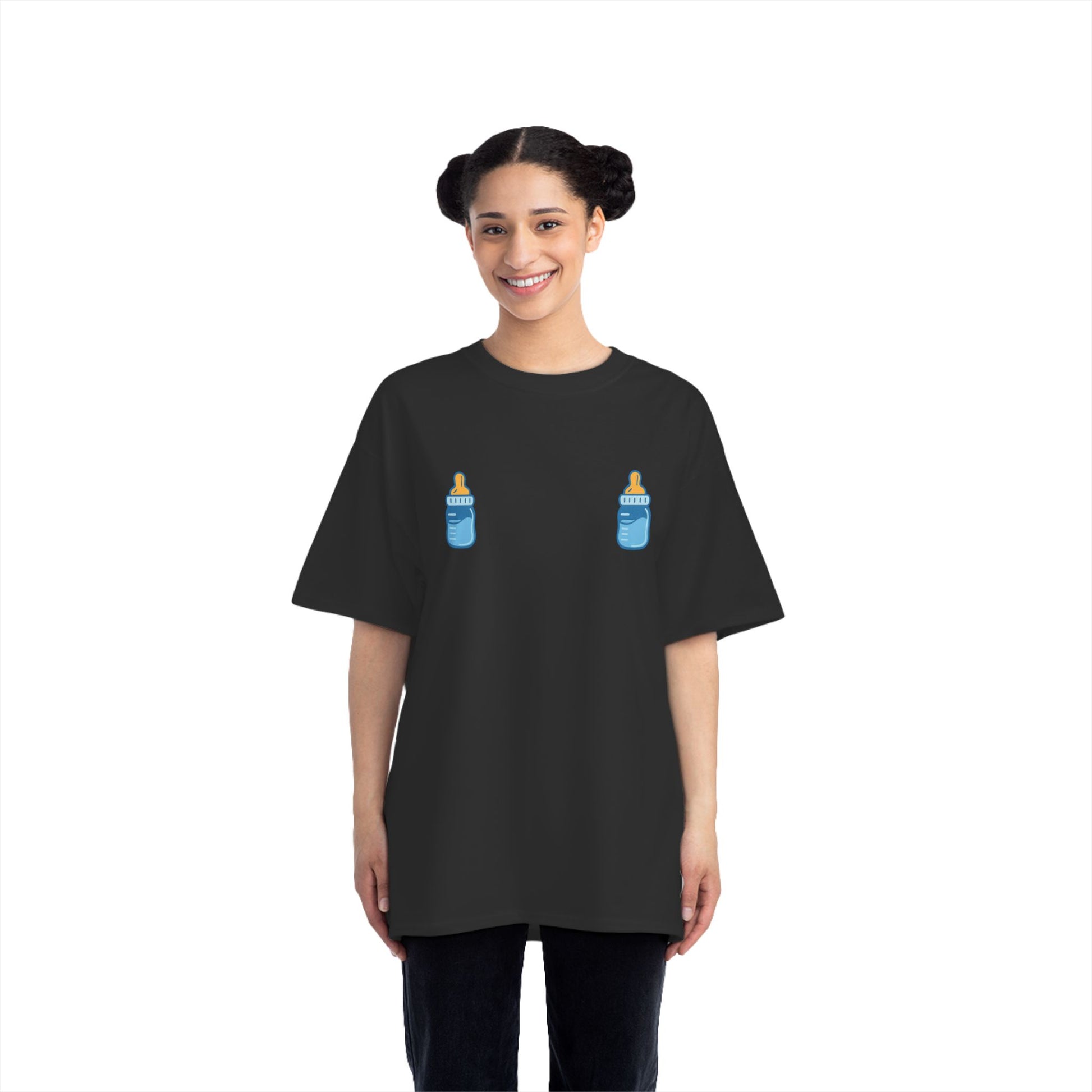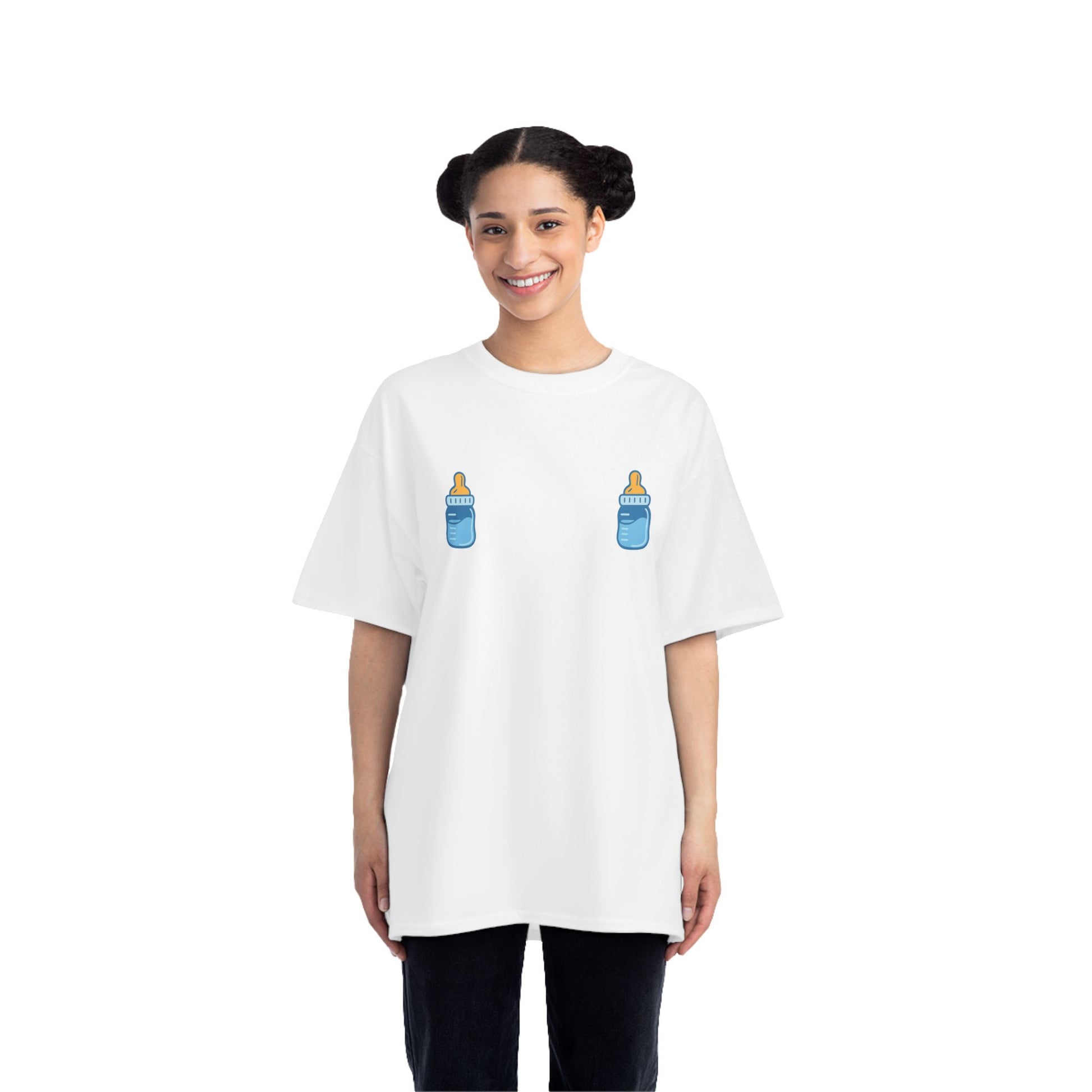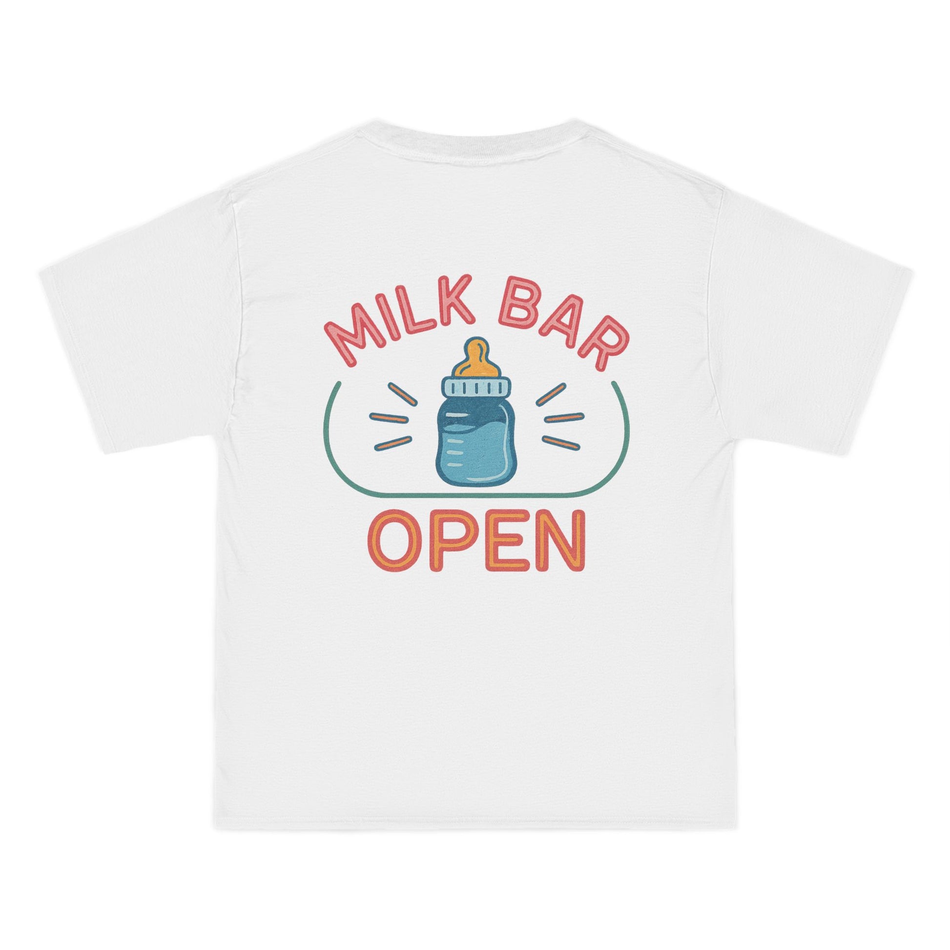 This soft, oversized tee features two vintage neon baby bottles perfectly placed over the boob zone — a subtle wink to your full-time, round-the-clock job. Flip it around and you'll find our bold "Milk Bar Open" graphic glowing loud and proud across the back.