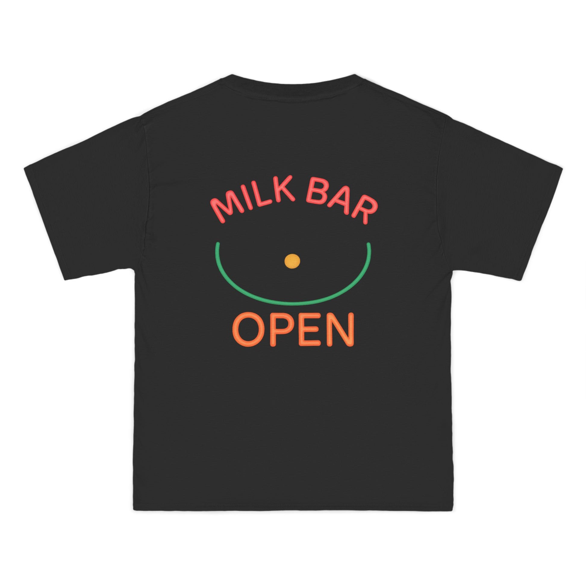 This soft, oversized tee features two vintage neon baby bottles perfectly placed over the boob zone — a subtle wink to your full-time, round-the-clock job. Flip it around and you'll find our bold "Milk Bar Open" graphic glowing loud and proud across the back.